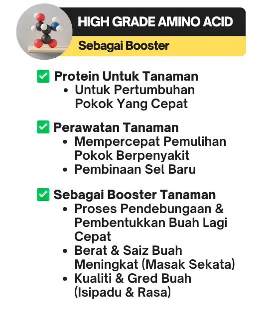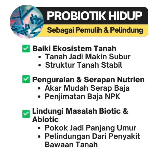 Probiotik dalam Probiomax betulkan struktur tanah, amino asid pula beri nutrien penting untuk tanaman. Hasilnya, tanah lebih subur, pokok lebih sihat, dan buah lebih lebat, berkualiti.