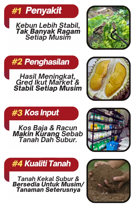 Ramai yang jimat kos baja kimia hingga 70%, timbangan hasil makin berat, buah makin besar, rasa lagi manis dan tanah makin subur. Memang berbaloi.